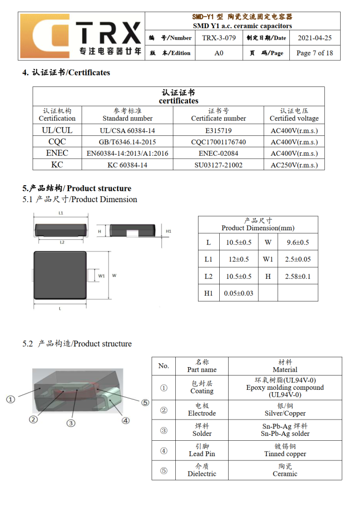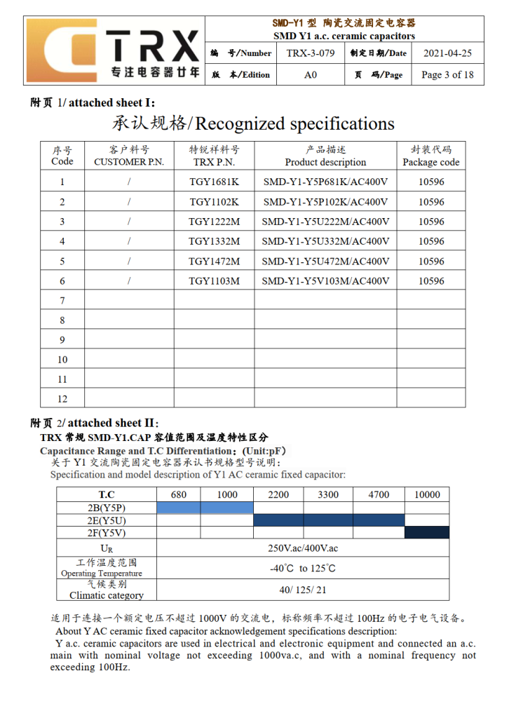 特銳祥高容量貼片Y1安規電容產品線目前共有六款產品,提供680pF~10000pF多種容值選擇,耐壓高達4000Vac,工作溫度-40℃~125℃,通過UL/CUL、CQC、ENEC、KC認證,滿足RoHS標準,覆蓋更多應用場景。