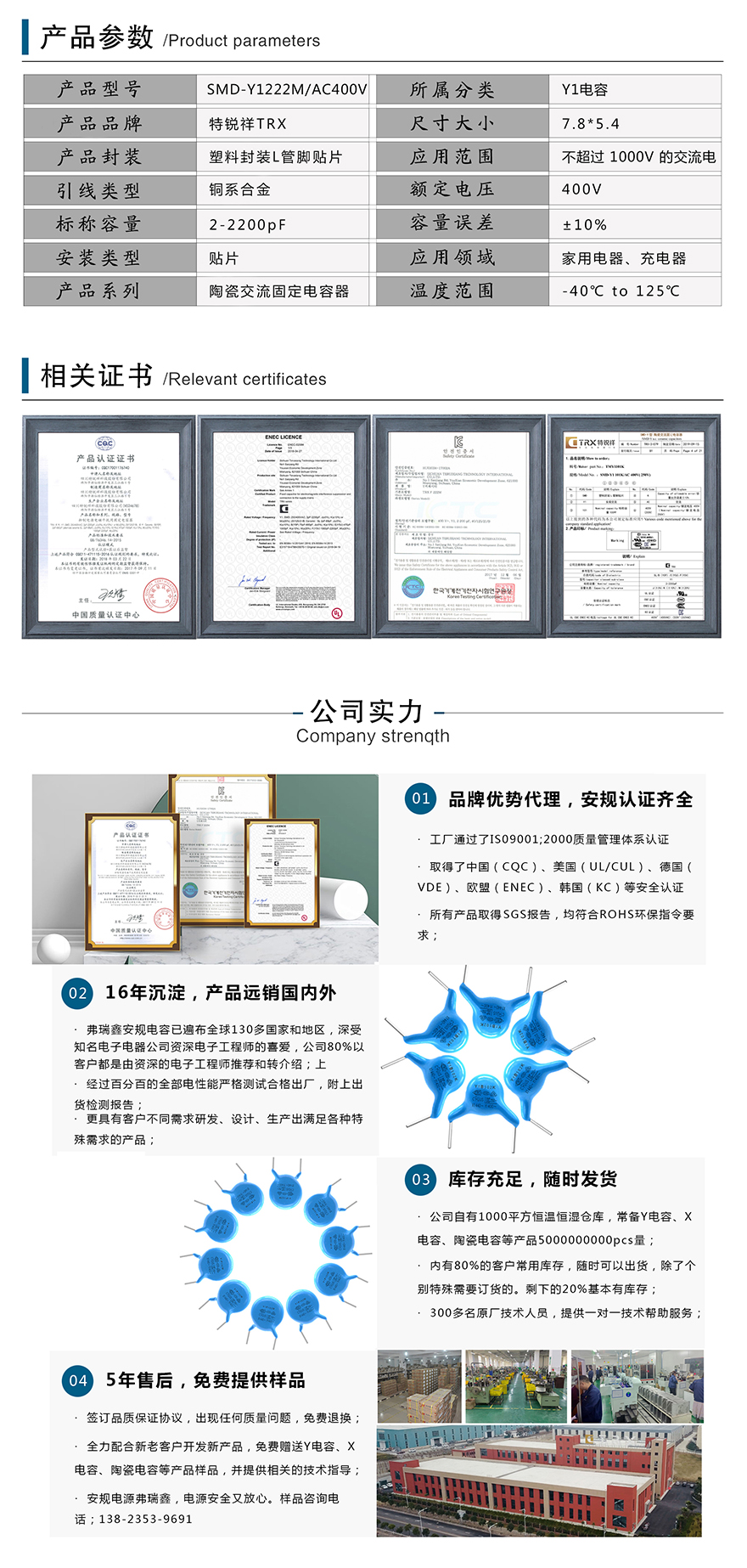 • 產品特性:①具有高介電系數的陶瓷介質 ②阻燃的環氧樹脂封裝 ③通過了CQC、UL/CUL、VDE、ENEC、KC等安全認證標準